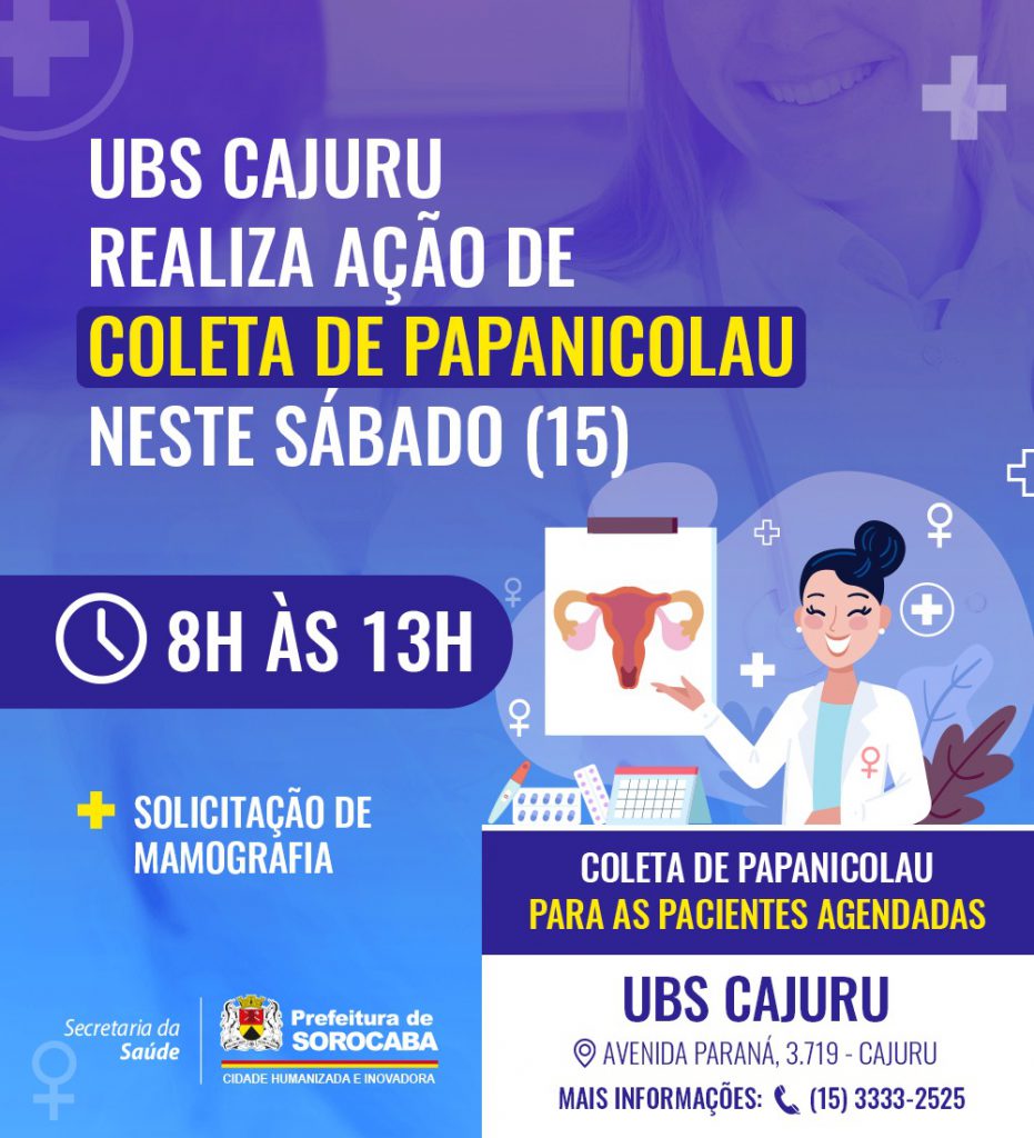 A Prefeitura de Sorocaba, por meio da Secretaria da Saúde (SES), realizará uma ação para a coleta de exame Papanicolau, preventivo ao câncer do colo de útero, neste sábado (15), das 8h às 13h, na Unidade Básica de Saúde (UBS) Cajuru. Nesta edição, serão feitos atendimentos para pacientes pré-agendadas.