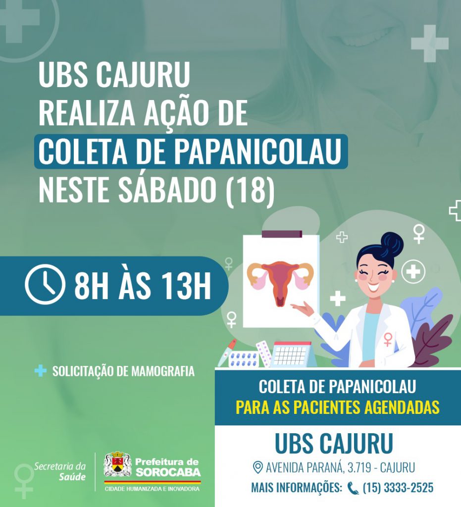 A Prefeitura de Sorocaba, por meio da Secretaria da Saúde (SES), realizará uma ação para a coleta de exame Papanicolau, preventivo ao câncer do colo de útero, neste sábado (18), das 8h às 13h, na Unidade Básica de Saúde (UBS) Cajuru. Nesta edição, serão feitos atendimentos para pacientes pré-agendadas.