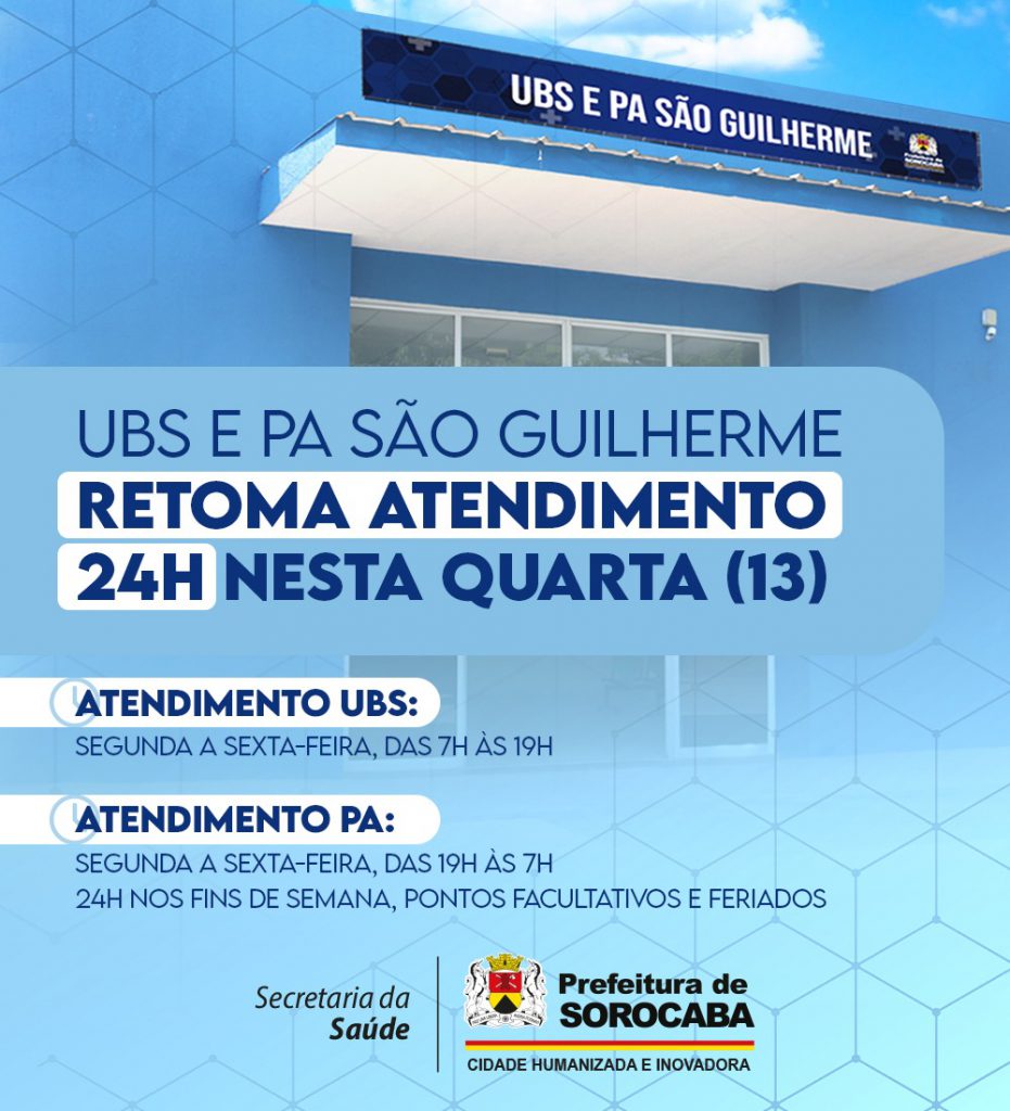 A UBS São Guilherme atenderá de segunda a sexta-feira, das 7h às 19h. Como PA, a unidade funcionará de segunda a sexta-feira, das 19h às 7h, e 24h nos fins de semana, pontos facultativos e feriados.