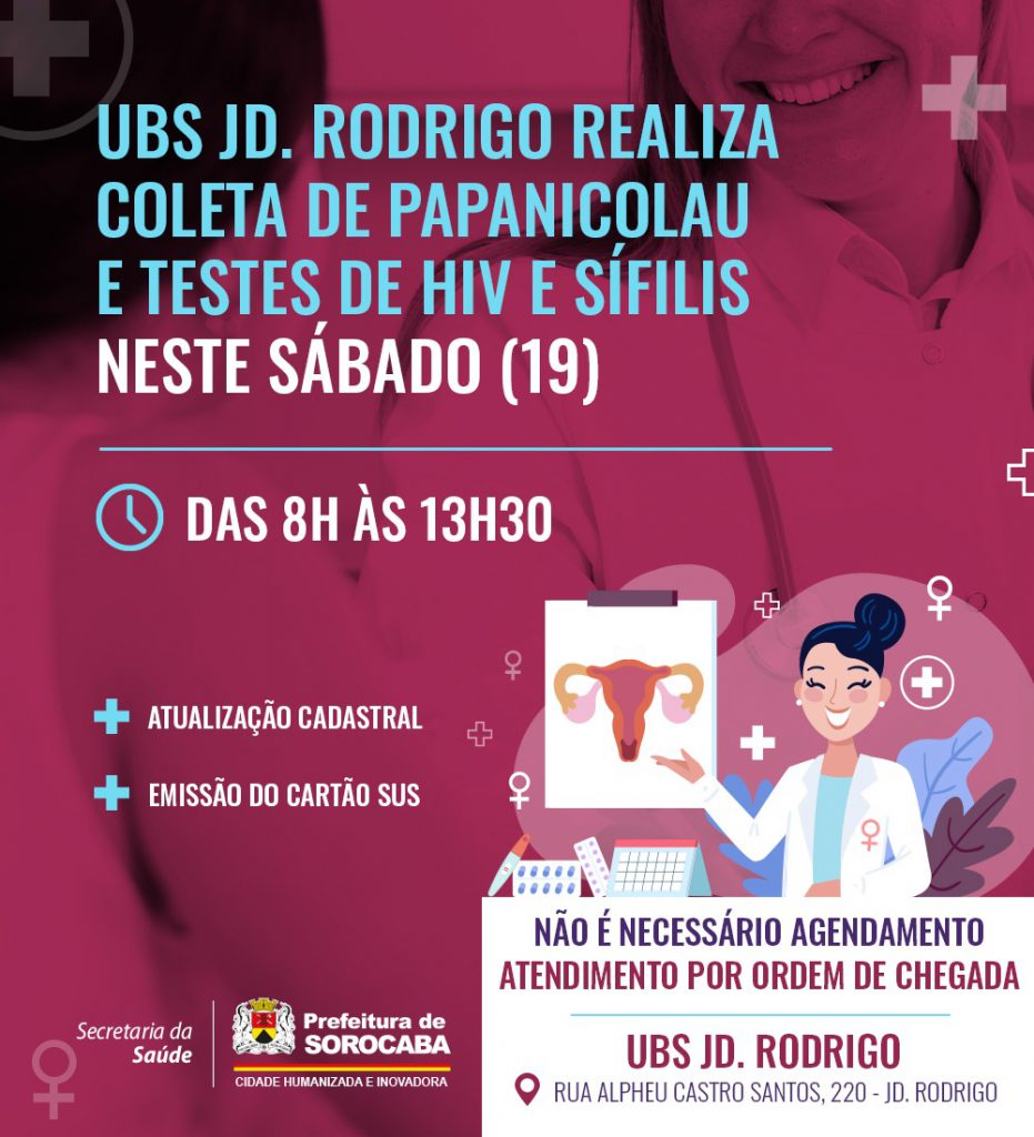 A Unidade Básica de Saúde (UBS) Jardim Rodrigo realiza, neste sábado (19), das 8h às 13h30, uma ação para a coleta do exame Papanicolau e testes rápidos para identificar HIV e sífilis, com foco nos moradores da região que não conseguem realizar seus exames preventivos durante a semana.