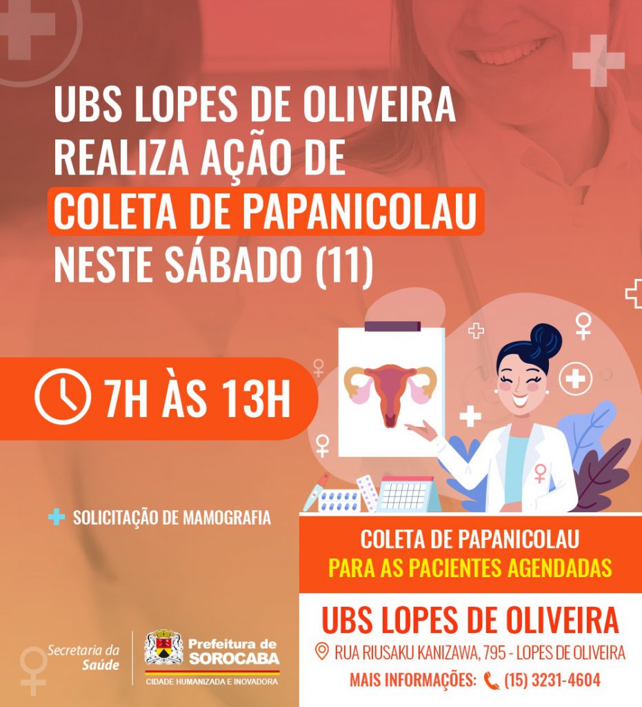 A Prefeitura de Sorocaba, por meio da Secretaria da Saúde (SES), realizará uma ação para a coleta de exame Papanicolau, preventivo ao câncer do colo de útero, neste sábado (11), das 7h às 13h, na Unidade Básica de Saúde (UBS) Lopes de Oliveira. Nesta edição, serão feitos atendimentos para pacientes pré-agendadas.