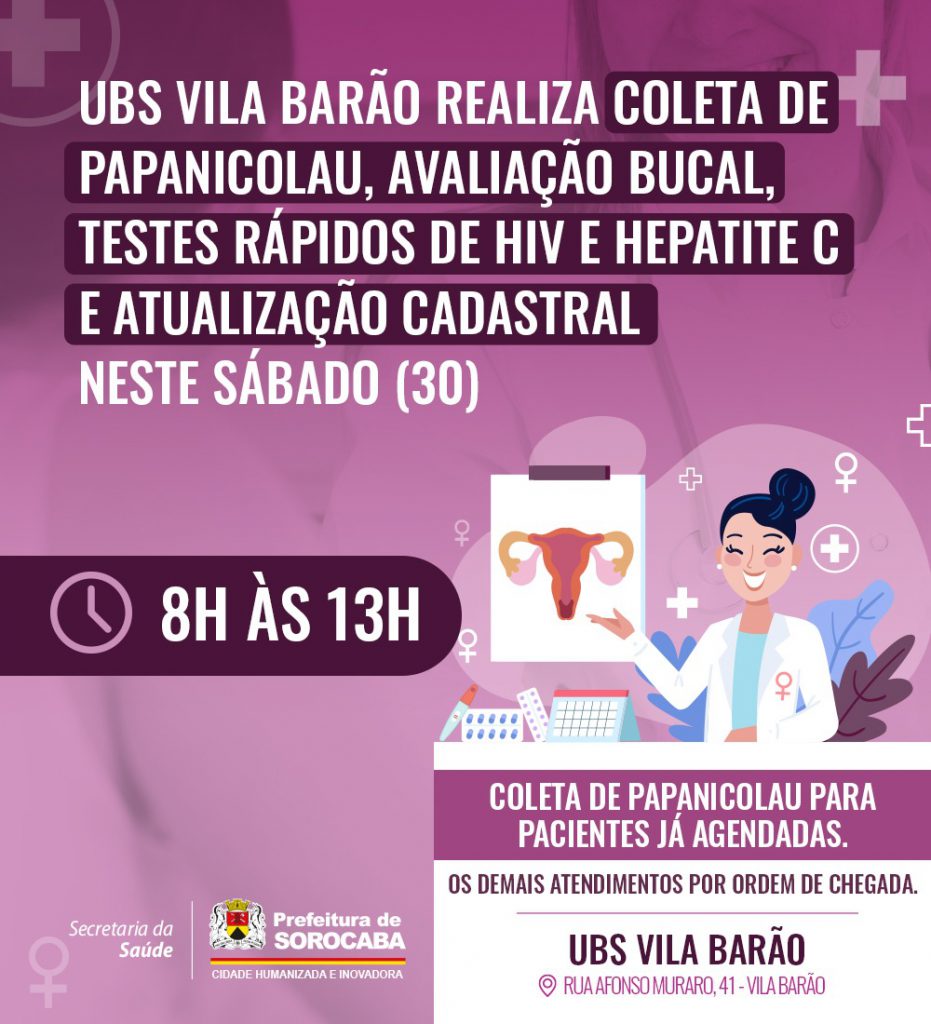 A Unidade Básica de Saúde (UBS) da Vila Barão realiza, neste sábado (30), das 8h às 13h, ação para a coleta do exame Papanicolau a pacientes previamente agendadas, além de avaliação bucal, testes rápidos para identificar possíveis casos de HIV e Hepatite C e atualização cadastral a todos os interessados.
