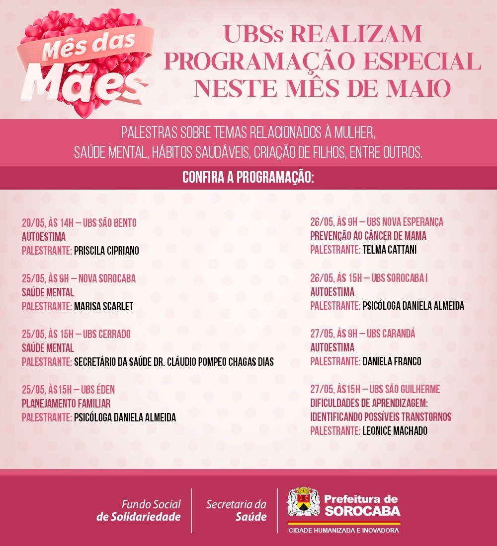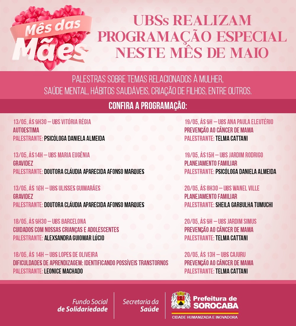 A Prefeitura de Sorocaba, por meio da Secretaria da Saúde (SES) e do Fundo Social de Solidariedade, realiza, a partir desta sexta-feira (13), até o final de maio, uma programação especial em várias Unidades Básicas de Saúde (UBSs), em comemoração ao mês das mães.
