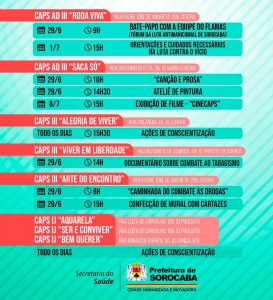 Por sua vez, a programação em prol do combate às drogas no CAPS AD III “Roda Viva” traz atividades com grupos abertos aos familiares, incluindo pessoas que façam parte das redes de apoio dos atendidos pela unidade. Nesta quarta-feira (29), às 9h, será realizado um bate-papo com a equipe do Flamas (Fórum da Luta Antimanicomial de Sorocaba). Na sexta-feira (1), às 15h, as atividades serão destinadas às pessoas próximas dos atendidos pela unidade, com orientações e cuidados necessários na luta contra o vício.