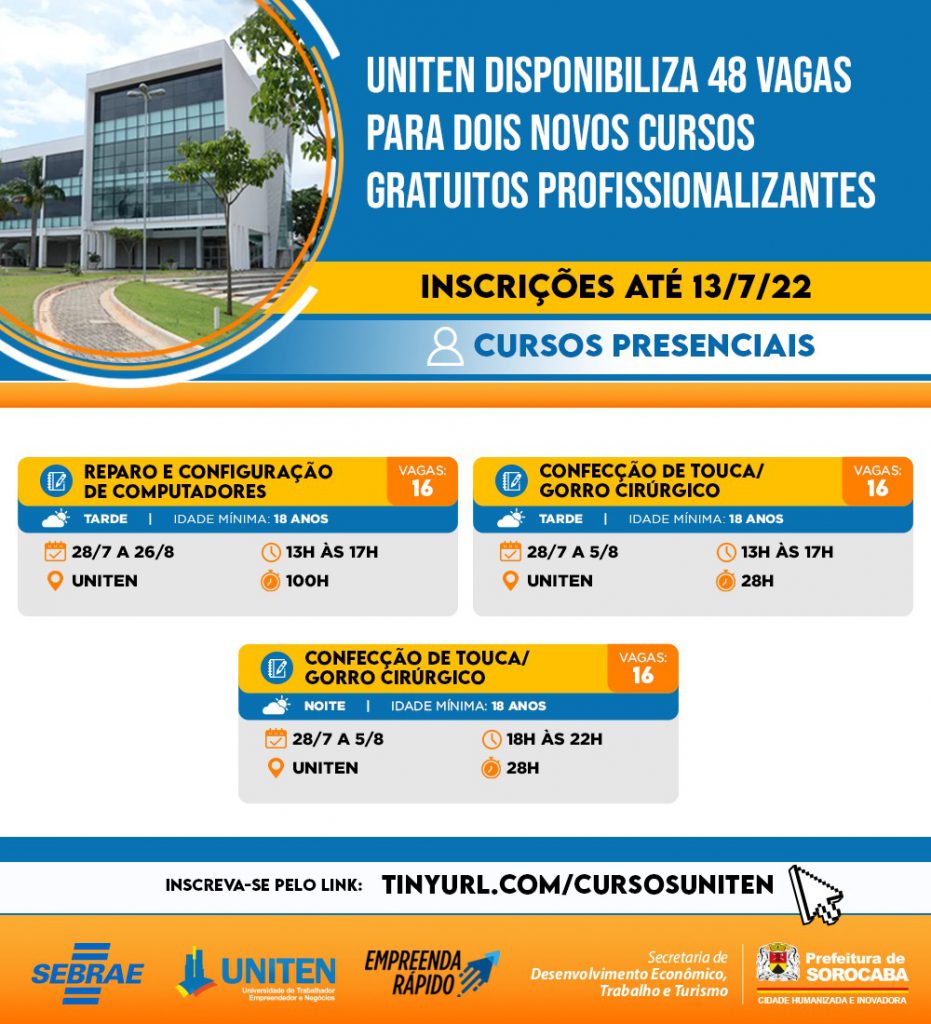 A Prefeitura de Sorocaba, por meio da Universidade do Trabalhador, Empreendedor e Negócios (Uniten), órgão vinculado à Secretaria de Desenvolvimento Econômico, Trabalho e Turismo (Sedettur), e em parceria com o Serviço Brasileiro de Apoio às Micro e Pequenas Empresas (Sebrae), pelo programa “Empreenda Rápido”, abre inscrições para dois novos cursos.