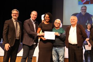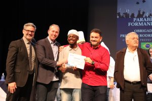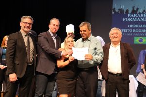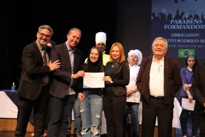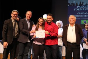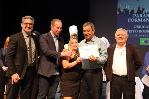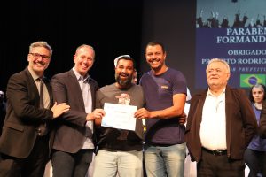 As autoridades, juntamente com os professores dos cursos, entregaram simbolicamente o certificado de conclusão a um aluno de cada turma, sendo eles: Abigail Pozzetti (Logística com Básico em Almoxarifado); Suellen Silva (Cuidador de Idosos); Sônia de Oliveira (Bolos e Tortas); Simone Hernandes (Panificação); Alda Mara de Souza (Depilação Facial com Linha); Tauany Nascimento Cardoso (Auxiliar Administrativo); Eric Apolinário (Leitura de Desenho e Metrologia); Cibelle Alves da Silva (Inspetor de Qualidade); Jenifer Venâncio (Manicure e Pedicure); Douglas dos Santos (Operador de Empilhadeira); Abner Henrique da Costa (Operador de Ponte Rolante); Jalyton Lindote dos Santos (Polimento de Automóveis) e Joel Faria Filho (Eletricista Residencial).