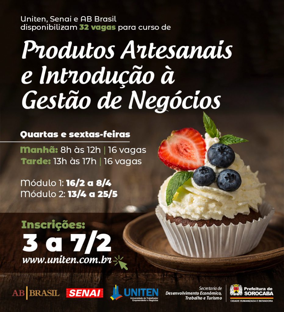A Universidade do Trabalhador, Empreendedor e Negócios (Uniten), vinculada à Secretaria Municipal de Desenvolvimento Econômico, Trabalho e Turismo (Sedettur), em parceria com o Serviço Nacional de Aprendizagem Industrial (Senai) e a AB Brasil, disponibiliza 32 vagas para o curso de qualificação profissional em Produtos Artesanais e Introdução à Gestão de Negócios.