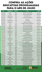 A Urbes – Trânsito e Transportes mantém uma programação contínua de atividades educativas, em pontos estratégicos da cidade. O calendário diário de ações para julho já está definido, com quatro tipos de iniciativas, que ocorrem pela manhã ou à tarde. Devido à pandemia da Covid-19, elas têm um formato diferenciado, evitando o contato pessoal e seguindo todas as medidas sanitárias preventivas, priorizando a comunicação visual.