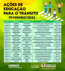 A Urbes – Trânsito e Transportes, nesta terça-feira (1), dá prosseguimento ao calendário de atividades educativas diárias de trânsito em Sorocaba. Para os primeiros 15 dias de fevereiro, estão programadas 23 ações referentes a oito temáticas diferentes, todas elas realizadas em pontos estratégicos da cidade.
