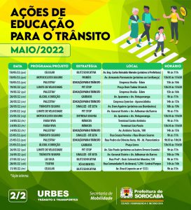 É possível acompanhar o calendário completo de ações da campanha “Maio Amarelo” nas artes, abaixo, e também nas mídias sociais da Prefeitura de Sorocaba: @prefeituradesorocaba e no site: www.sorocaba.sp.gov.br.