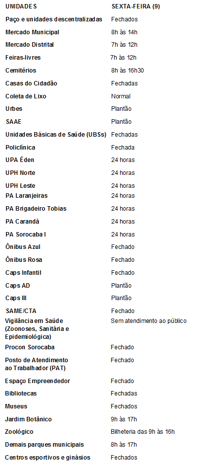 Os serviços prestados pelos setores essenciais, como atendimentos de urgência e emergência, seguem normalmente, sem alteração. Da mesma forma, os de coleta de lixo, que mantêm o calendário habitual. As feiras-livres também funcionam normalmente.