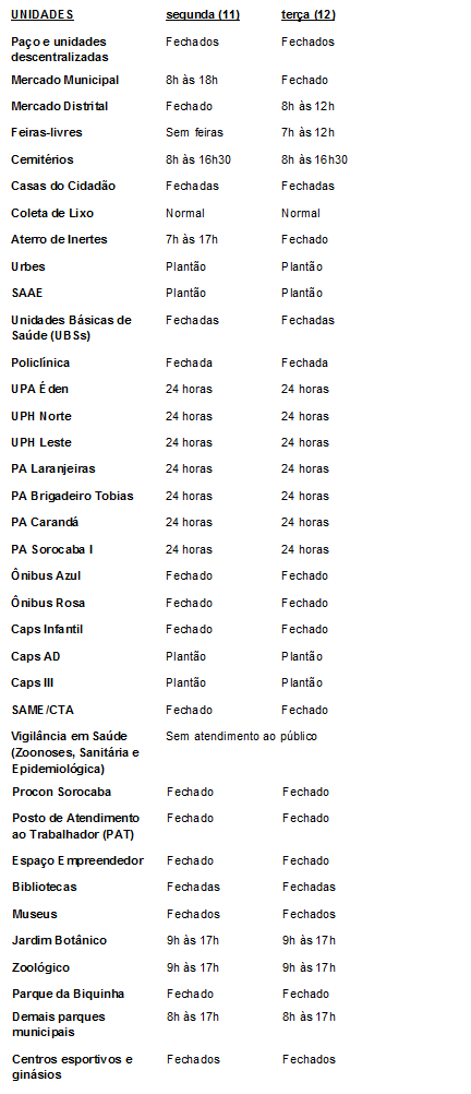 Os serviços prestados pelos setores essenciais, como atendimentos a urgências e emergências, seguem normalmente, sem alteração. Da mesma forma, os de coleta de lixo, que mantêm o calendário habitual. As feiras-livres também funcionam normalmente.